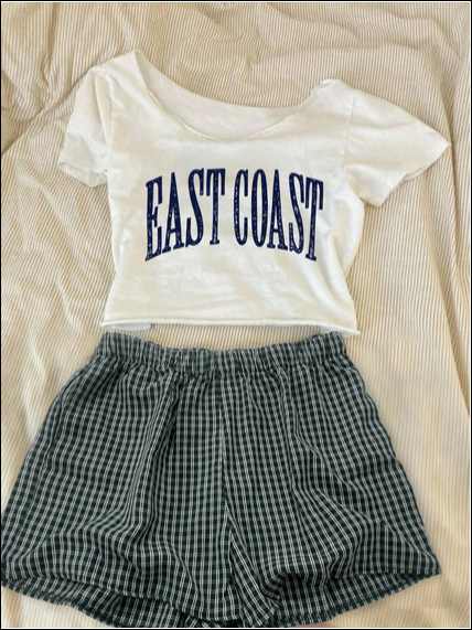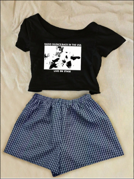 2 ชิ้น ชุดผู้หญิง – เสื้อยืดพิมพ์ลายมินิมอล & กางเกงขาสั้นลายสก๊อต